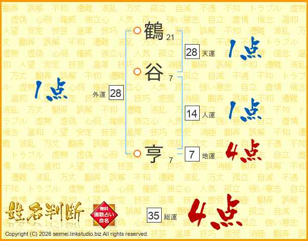 生活面を象徴する運勢です。外部から受ける影響力を表し、結婚運、家庭運や職場、環境への順応性を表します。総運から人運を引いた画数。姓や名が1文字の場合を除く。