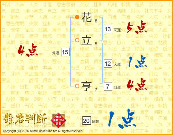 生活面を象徴する運勢です。外部から受ける影響力を表し、結婚運、家庭運や職場、環境への順応性を表します。総運から人運を引いた画数。姓や名が1文字の場合を除く。