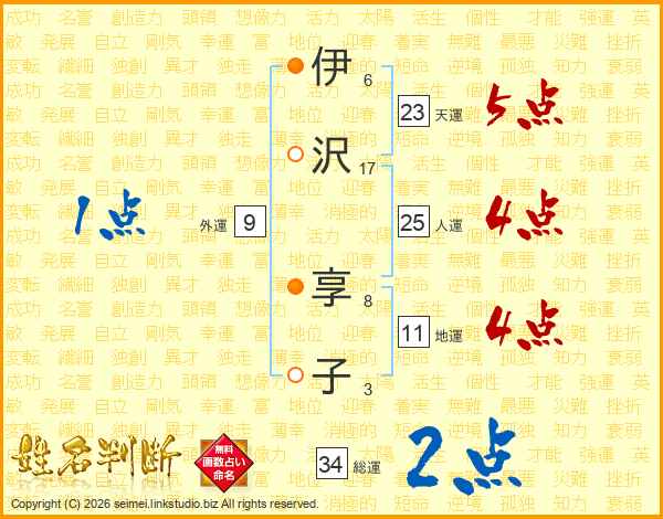 伊(6画)沢(17画) 享(8画)子(3画)