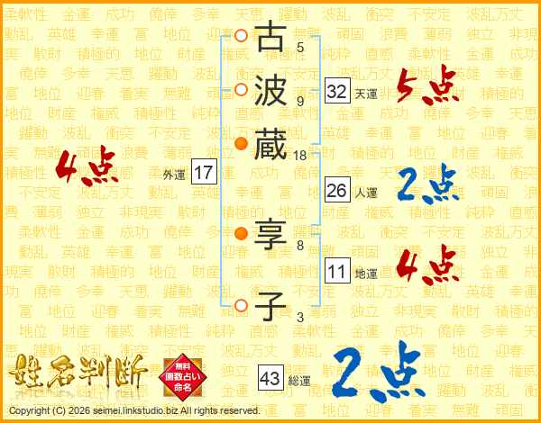 古(5画)波(9画)蔵(18画) 享(8画)子(3画)