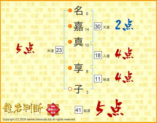 名(6画)嘉(14画)真(10画) 享(8画)子(3画)