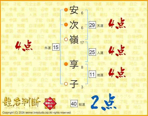 安(6画)次(6画)嶺(17画) 享(8画)子(3画)