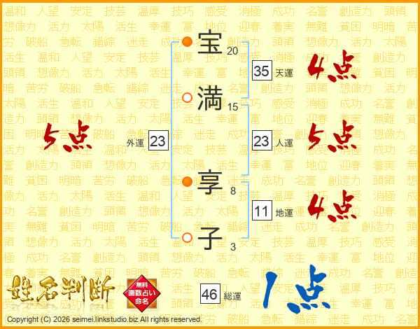 生活面を象徴する運勢です。外部から受ける影響力を表し、結婚運、家庭運や職場、環境への順応性を表します。総運から人運を引いた画数。姓や名が1文字の場合を除く。
