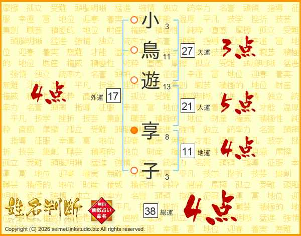 小鳥遊享子さんの総運は38画の4点!