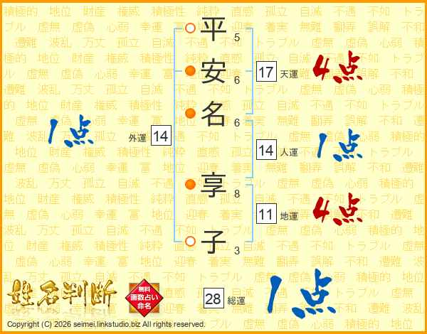 平(5画)安(6画)名(6画) 享(8画)子(3画)