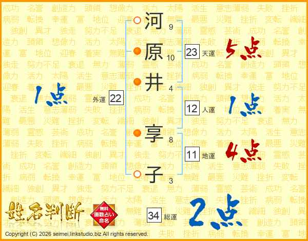 河(9画)原(10画)井(4画) 享(8画)子(3画)