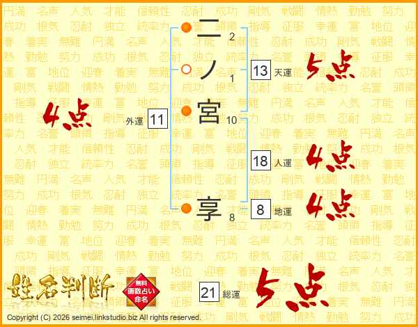 生活面を象徴する運勢です。外部から受ける影響力を表し、結婚運、家庭運や職場、環境への順応性を表します。総運から人運を引いた画数。姓や名が1文字の場合を除く。