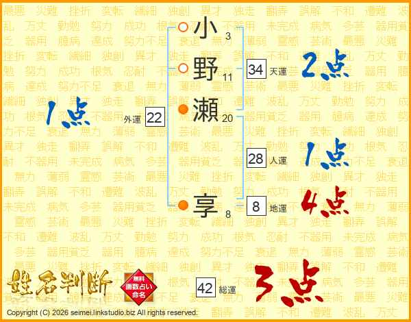 小(3画)野(11画)瀬(20画) 享(8画)
