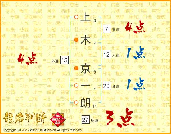 上(3画)木(4画) 京(8画)一(1画)朗(11画)