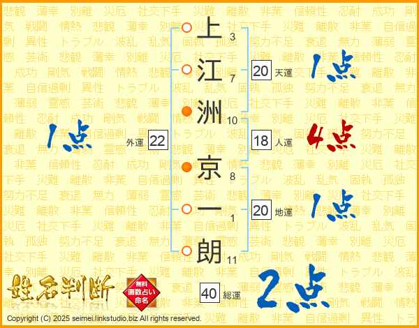 生活面を象徴する運勢です。外部から受ける影響力を表し、結婚運、家庭運や職場、環境への順応性を表します。総運から人運を引いた画数。姓や名が1文字の場合を除く。