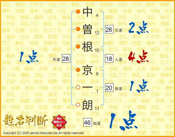 中(4画)曽(12画)根(10画) 京(8画)一(1画)朗(11画)