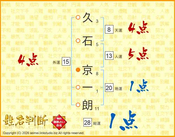 久(3画)石(5画) 京(8画)一(1画)朗(11画)