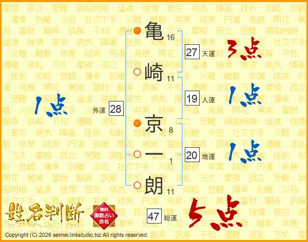 亀(16画)崎(11画) 京(8画)一(1画)朗(11画)
