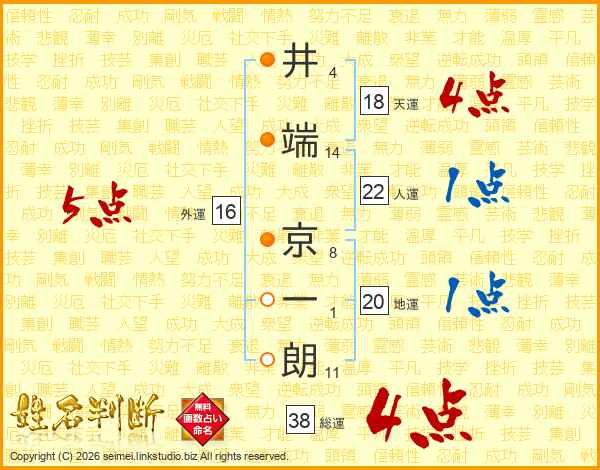 井(4画)端(14画) 京(8画)一(1画)朗(11画)