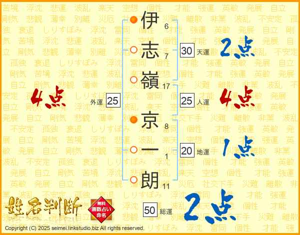伊(6画)志(7画)嶺(17画) 京(8画)一(1画)朗(11画)