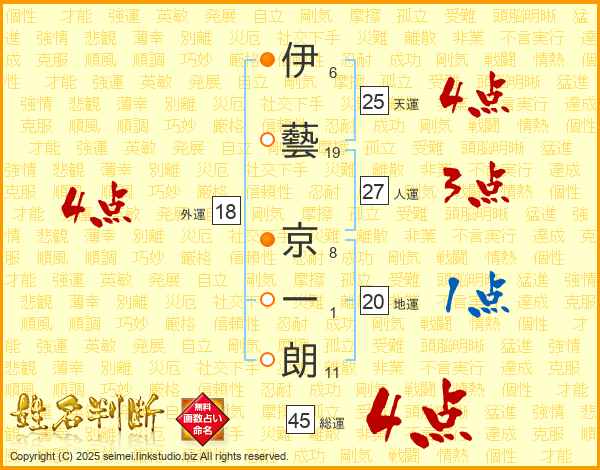 伊(6画)藝(19画) 京(8画)一(1画)朗(11画)