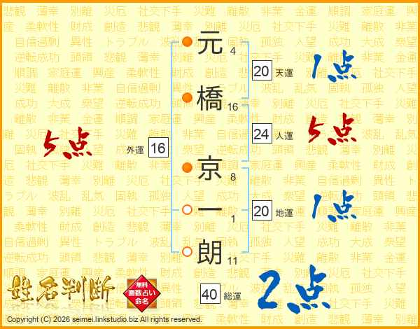 元(4画)橋(16画) 京(8画)一(1画)朗(11画)
