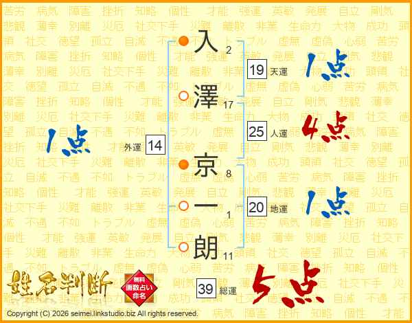 入(2画)澤(17画) 京(8画)一(1画)朗(11画)