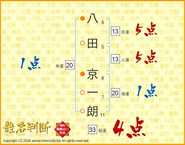 八(8画)田(5画) 京(8画)一(1画)朗(11画)
