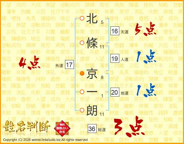 北(5画)條(11画) 京(8画)一(1画)朗(11画)