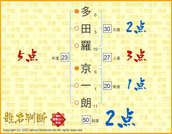 多(6画)田(5画)羅(19画) 京(8画)一(1画)朗(11画)