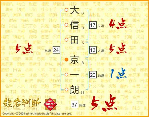 大(3画)信(9画)田(5画) 京(8画)一(1画)朗(11画)