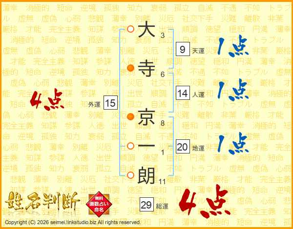 大(3画)寺(6画) 京(8画)一(1画)朗(11画)