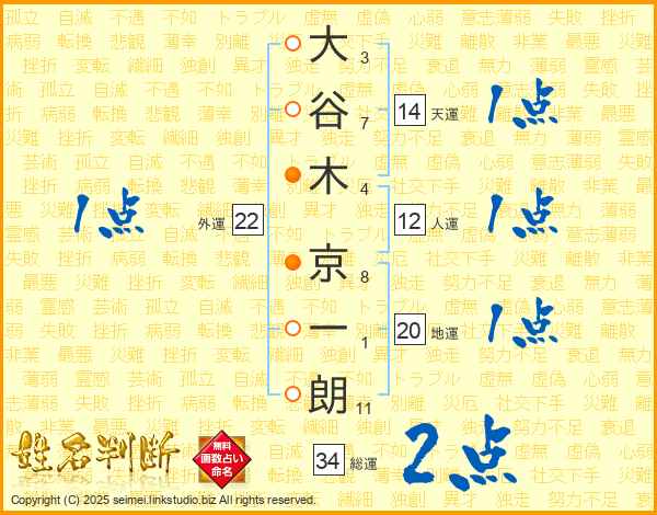 大(3画)谷(7画)木(4画) 京(8画)一(1画)朗(11画)