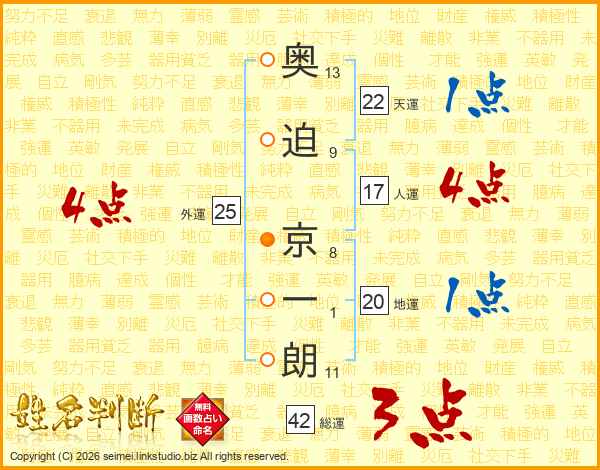 奥迫京一朗さんの天運は22画の1点!