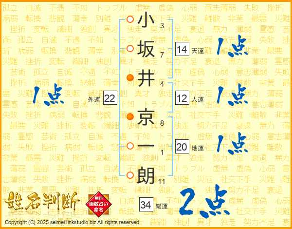 小(3画)坂(7画)井(4画) 京(8画)一(1画)朗(11画)