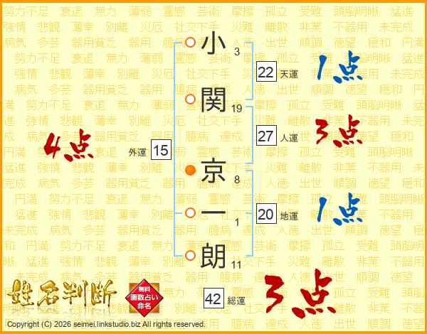 小(3画)関(19画) 京(8画)一(1画)朗(11画)