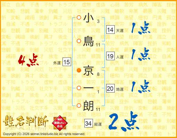 小(3画)鳥(11画) 京(8画)一(1画)朗(11画)