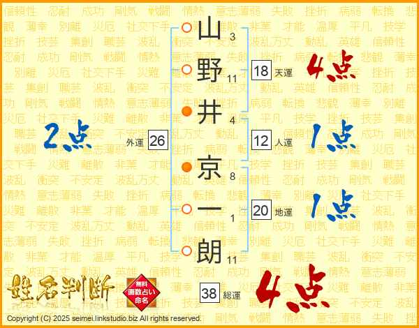 山野井京一朗さんの総運は38画の4点!