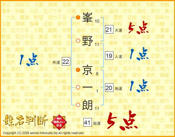 峯(10画)野(11画) 京(8画)一(1画)朗(11画)