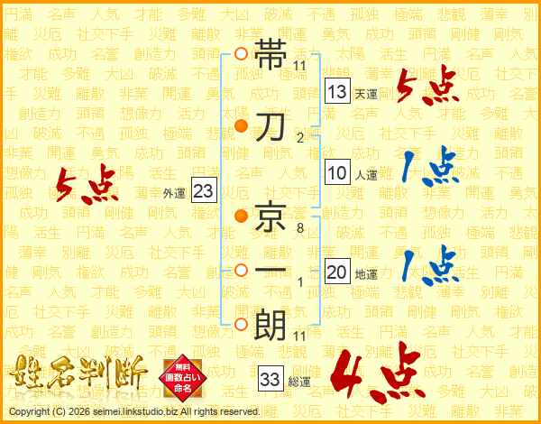 帯(11画)刀(2画) 京(8画)一(1画)朗(11画)