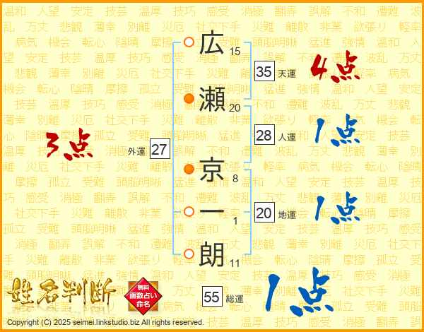 広(15画)瀬(20画) 京(8画)一(1画)朗(11画)