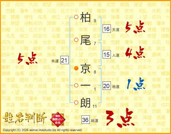 柏(9画)尾(7画) 京(8画)一(1画)朗(11画)