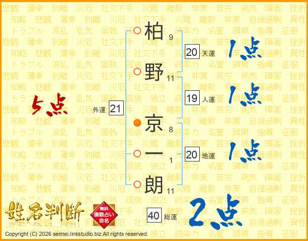 柏(9画)野(11画) 京(8画)一(1画)朗(11画)