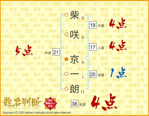 柴(9画)咲(9画) 京(8画)一(1画)朗(11画)