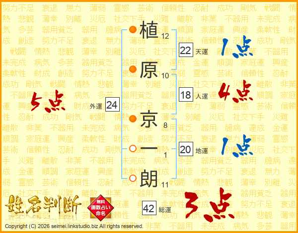 植(12画)原(10画) 京(8画)一(1画)朗(11画)