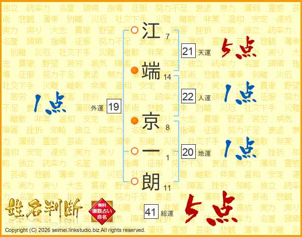 あなたの人生を表す1番重要な運勢です。生涯を通じて影響する総合運となり、主に50歳以降の晩年期に影響を及ぼします。苗字と名前の合計画数。