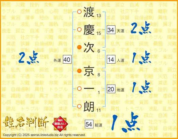 渡(13画)慶(15画)次(6画) 京(8画)一(1画)朗(11画)