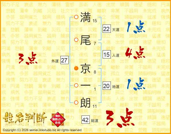 満(15画)尾(7画) 京(8画)一(1画)朗(11画)