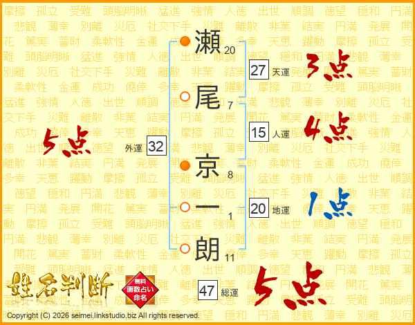 瀬(20画)尾(7画) 京(8画)一(1画)朗(11画)