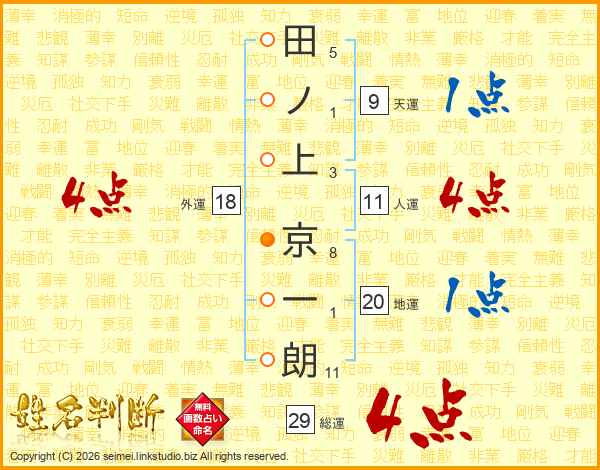 田(5画)ノ(1画)上(3画) 京(8画)一(1画)朗(11画)