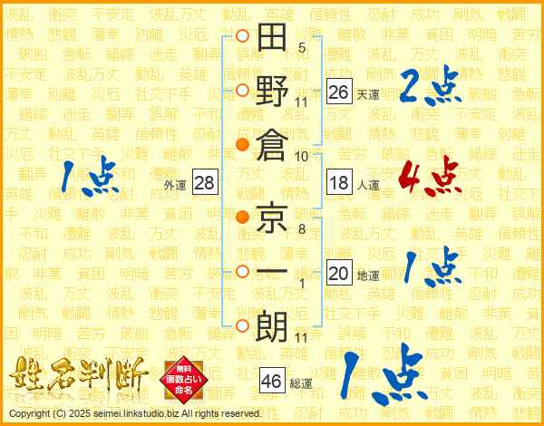 田(5画)野(11画)倉(10画) 京(8画)一(1画)朗(11画)