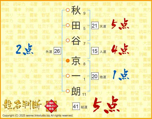 秋(9画)田(5画)谷(7画) 京(8画)一(1画)朗(11画)