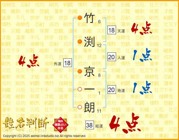 竹(6画)渕(12画) 京(8画)一(1画)朗(11画)