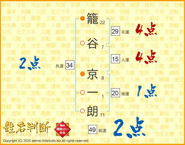 籠(22画)谷(7画) 京(8画)一(1画)朗(11画)
