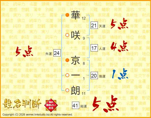 華(12画)咲(9画) 京(8画)一(1画)朗(11画)